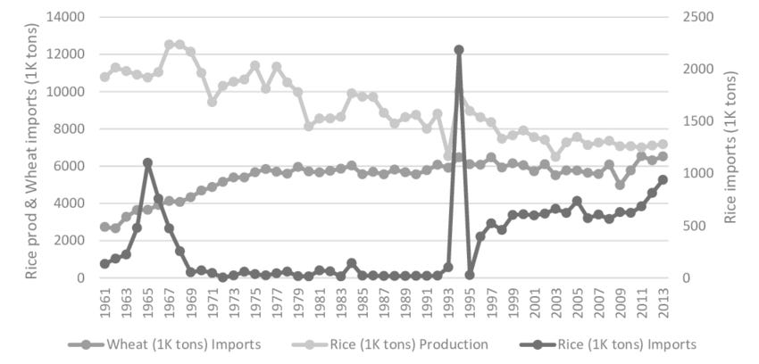 In the late 1980s Japan came under increasing pressure to import rice from the United States. The rice, farmed in California, was identical to the Japonica strain grown in Japan, but was seen as totally alien. It was Japonica yet not Japanese. Both rural Japanese and urbanites (who largely footed the bill in both high prices and tax to support subsidies) were opposed to it. But then Japanese crops failed. A 1993 headline in the LA Times reads like a telegram from the past: “Crop a Disaster, Reluctant Japan to Import Rice.”[7] This resulted in not just a giant spike (see table below) to secure the supply in the moment but also helped to open the door to steady imports from (primarily) The United States and Thailand. While the door is open, heavy tariffs remain. In 2013 import tariffs for polished rice reached 777.7%.[6]